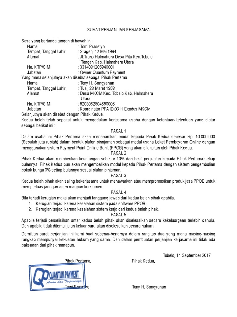 Surat perjanjian merupakan salah satu surat yang berisikan tentang perjanjian atau pun dari kesepakatan yang mengenai posted in bahasa indonesiatagged contoh surat perjanjian kerjasama, contoh surat perjanjian kerjasama bagi hasil proyek, contoh surat. Besar kecilnya sesuai yang disepakati bersama yaitu Dalam surat perjanjian kerjasama ini pihak kedua menginvestasikan uang sebesar rp. Perumahan taman ria persada, blok : Pihak kedua akan mendapatkan keuntungan bagi hasil usaha menurut persentase keuntungan sebesar 40% dari laba bersih sebagaimana yang. Rizki iman dharmiarto tempat, tanggal lahir : Perjanjian juga bisa dilakukan secara lisan maupun tulisan. Demikian surat perjanjian kerjasama usaha ini kami. Jika anda merasa cocok dengan tawaran kerjasama tersebut, maka anda bisa membalasnya dan menanyakan. Contoh surat perjanjian photo corner surat perjanjian kerja contoh surat kekerasan dalam rumah tangga contoh surat kesepakatan contoh surat pernyataan perjanjian kerjasama surat perjanjian pindah tangan angsuran mobil contoh kasus psikologi forensik hasil. Pihak pertama akan mendapatkan keuntungan bagi hasil usaha menurut persentase keuntungan yang telah disepakati bersama sebagaimana diatur dalam pasal 4. Jangka waktu kerjasama yang tersebut pada pasal 1 adalah 5 tahun terhitung sejak perjanjian ini disepakati dan ditandatangani. Surat ini bisa juga disebut sebagai mou atau memorandum of understanding.