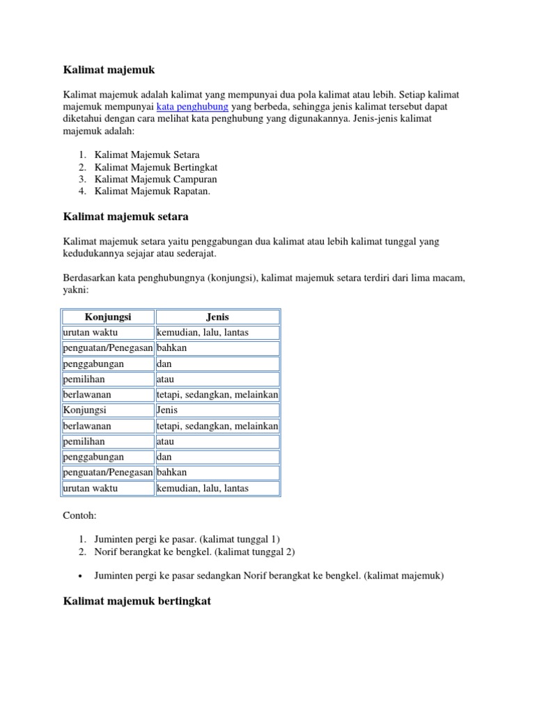 Kemudian disatukan dengan menggunakan kata penghubung. Penjelasan kalimat majemuk dan jenisnya seperti: Kalimat majemuk yang merupakan gabungan dari kalimat majemuk setara dengan kalimat majemuk bertingkat. Demikianlah artikel tentang kalimat majemuk campuran : Coba simak contoh kalimat di bawah ini : Rasa hormat terhadap peraturan itu selalu mengalami perkembangan. Contoh paragraf campuran tentang kesehatan. Kalimat majemuk bertingkat, setara, rapatan, campuran, perluasan disertai contoh dan penjelasan lengkap. Kalimat majemuk campuran ialah kumpulan dari kalimat majemuk setara dan bertingkat. Kalimat majemuk campuran merupakan gabungan kalimat majemuk setara atau rapatan dengan hubungan antara klausa pada kalimat majemuk campuran setara dan juga bertingkat. Kalimat majemuk sendiri terdiri dari kalimat. Kalimat majemuk campuran biasanya terdiri dari 3 kalimat tunggal. Perbedaan antara klausa utama dan klausa adalah konjungsi.